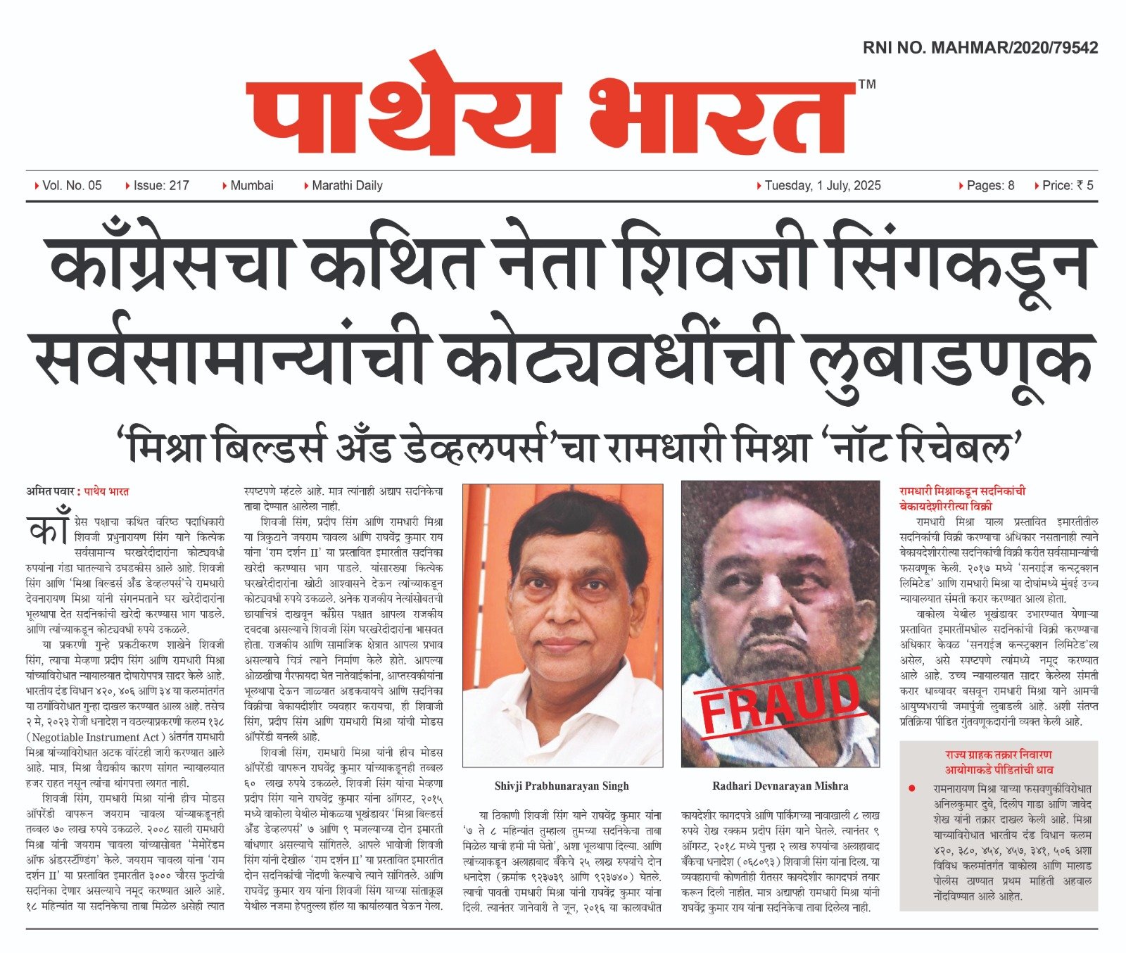 काँग्रेस पक्षाचा कथित वरिष्ठ पदाधिकारी शिवजी प्रभुनारायण सिंग याने कित्येक सर्वसामान्य घरखरेदीदारांना कोट्यवधी(Looting of Crores) रुपयांना गंडा घातल्याचे उघडकीस आले आहे. शिवजी सिंग आणि ‘मिश्रा बिल्डर्स अँड डेव्हलपर्स’चे रामधारी देवनारायण मिश्रा यांनी संगनमताने घर खरेदीदारांना भूलथापा देत सदनिकांची खरेदी करण्यास भाग पाडले. आणि त्यांच्याकडून कोट्यवधी रुपये उकळले.
